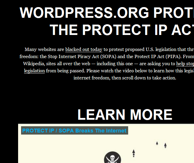 WordPress.orgWordPress.com現在、WordPress.com、WordPress.org 共に SOPA/PIPA 法案への抗議として、トップページが変更されているようですね。